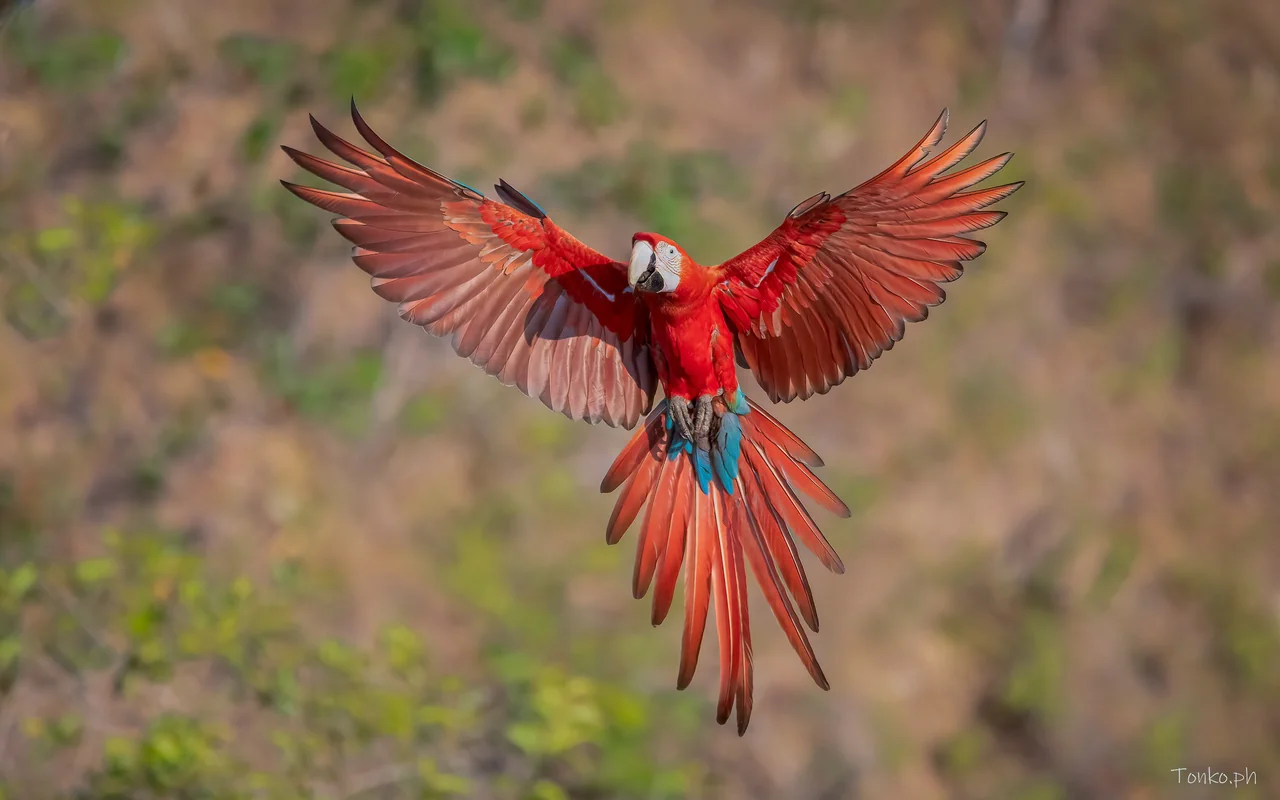- Les stries rouges sur le visage (absentes chez l’Ara rouge).