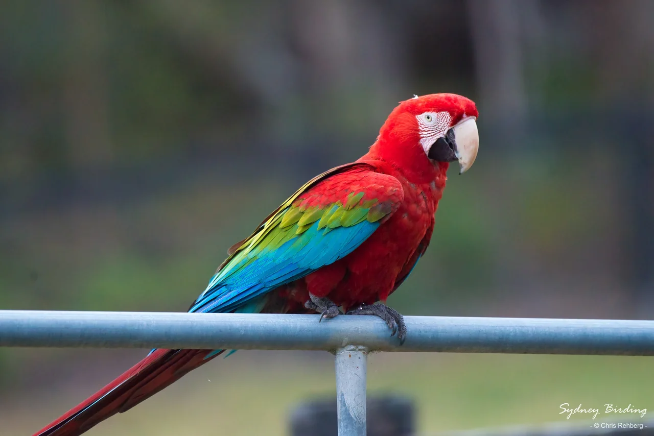 - Plumage : Corps et tête rouge écarlate, ailes vertes et bleues, queue longue et pointue.
