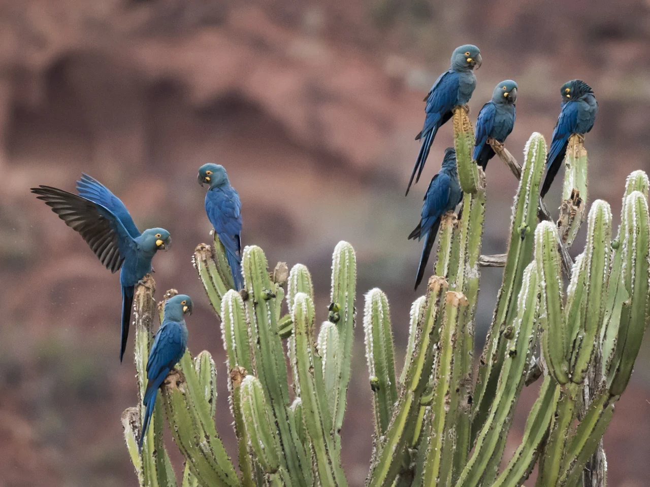 Cet oiseau est endémique du Brésil, spécifiquement dans le Nordeste, entre les régions de Bahia et du plateau de Raso da Catarina. Il affectionne les caatingas, des forêts sèches épineuses parsemées de palmiers licurí (Syagrus coronata), essentiels à son alimentation. Les falaises de grès environnantes lui servent de site de nidification et de refuge nocturne. Contrairement à d’autres aras, il est sédentaire, lié à ses falaises toute l’année.